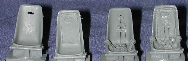 Cutting Edge has recently issued a number of items for the 1/32 Matchbox and/or Hasegawa Bf-109E. This review covers a full range of seats in various configurations that can be used to enhance the cockpit of either of the afore-mentioned kits. The seats are very well molded and should be relatively easy to remove from the resin blocks. There are two seats to each set. Here is a short list of the seats and what they offer. They are shown above listed from left to right.