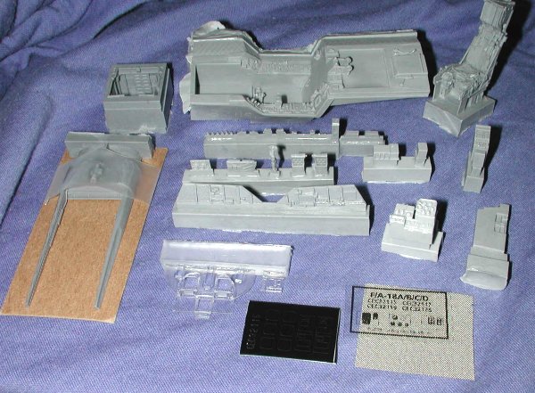Thanks to the Academy 1/32 F-18C, there have been a plethora of aftermarket bits for it. Included in that mass of stuff is this superb aftermarket cockpit set from Cutting Edge. Rather than go into a listing of what it includes, I'll just say that it is a total replacement for the Academy kit. It also includes the avionics bay just behind the pilot's seat, which is a nice touch. The instrument panel is in clear so an acetate instrument panel is provided to go behind that. Black Magic masks are also given so that you can paint the transparent CRT faces, and when dry, mask them so you can paint the rest of the instrument panel. There is also a section of fine screen, which apparently goes over the little avionics bay. Odd that it isn't mentioned in the instructions.