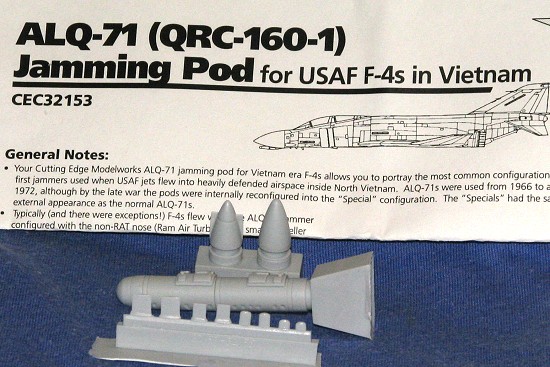This is a nice set that makes into an ALQ-71 Jamming Pod as carried by US F-4 Phantom II's during Vietnam and after until the ALQ-101 came into use. This pod was often carried in one of the forward Sparrow bays or could be under the wing rack. The kit itself contains a body, nose and tail cap, and an assortment of antennas. There are two varieties of long and short antennas. These were used in pairs and not mixed. You also have the option of having a RAT powered jammer by leaving on the small vanes on the nose. Conversely, it could be internally powered, in which case simply sanding off the vanes is all that is needed. A very nice accessory that will add that little bit extra to your next 1/32 Phantom model.