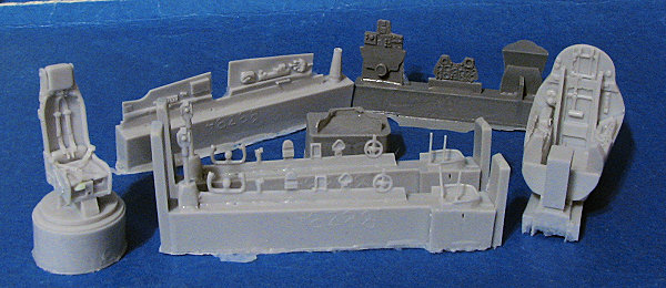 This set provides all you need and comes with a tub, seat side panels, instrument panels, anti-glare shield, defogger panel and two sprues with control wheels, rudder pedals, fans and few other bits and pieces. Not shown is an acetate instrument piece. One paints the back of this white and sands down the back of the resin instrument panel to open up the instrument holes.