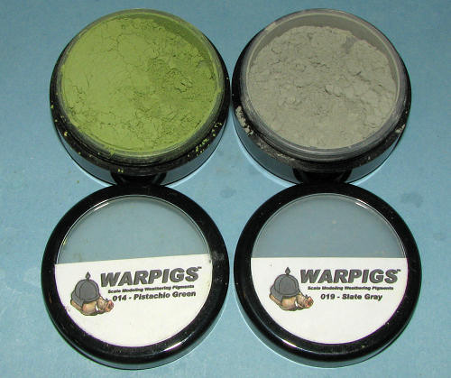 Each of the screw top jars contains 20 ml of pigment and, of course, you can mix the various colors. Two shades were recieved as review samples; Pistachio Green and Slate Grey. I gave them both a try as dry pigments and found that they work quite well. They stick well to the brush I was using, though are not so sticky that they are difficult to remove when over-applied. In fact, if you are looking for a pigment that will provide that additional look of light to heavy weathering, then these would very much fill the bill.