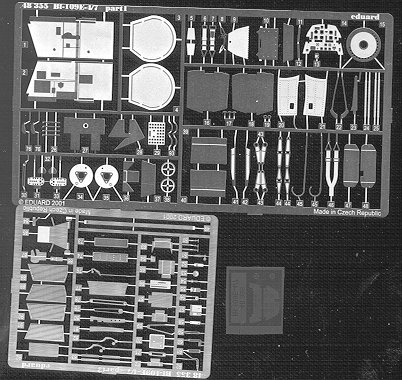This particular set is for the Hasegawa 1/48 Bf-109E-4/7, but could easily be used on the earlier versions as well for little is different in regards to the E-1/3. Mostly, one would leave off the bomb detail bits and perhaps the head armor depending on the time frame one is modeling.