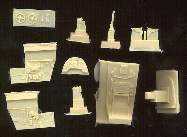 This set is a complete replacement of the complete cockpit for the Hobbycraft Bf-109F/G kits. All parts from the edge of the cockpit down are replaced by this set. Included are floor, sidewallys, instrument panel, gun breech, rudder pedals & supports, control stick, trim wheels, throttle, and gunsight.