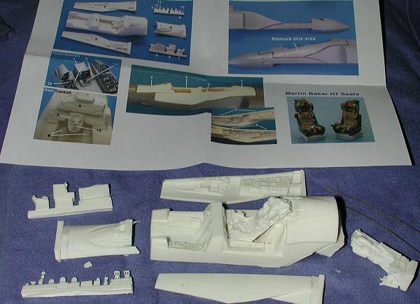 You know, I've never seen a cockpit set that has been designed in the way that this one from Legend has been done. Most will have you simply replace the kit bits with resin ones. This time, you replace entire sections of the airframe, a quite novel approach to things. Each of the exterior panels has the appropriate interior bits on the other side. This not only cuts down on the fiddlyness of the whole thing, but should make for an easier installation. The resin casting blocks are located in areas that don't require a lot of cutting and sanding as on some other makes of resin cockpits and I appreciate that. The instructions show you exactly where to to your cutting on the kit fuselage and it seems simple enough to me. No specific color information is written out, but there are lots of color images on the box top and in the set. A couple of lengths of copper wire are also supplied for the bang seat upper pull handles. Overall, it looks like a very nice set and one that is most welcome.