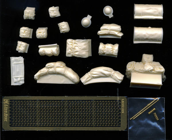 This new set is designed for the new Bronco kit of this British Armored Car. Lion Roar has produced this set in very limited numbers for the AA variant. It includes two new metal barrels for the .50 cal guns, a length of photo etch barbed wire for the abatis, and a number of superbly molded resin bits to be placed around the car itself. This includes two  fuel drums, an assortment of blankets and packs as well as a pair of helmets. There is a full set of assembly and placement instructions provided. Like other Lion Roar sets it is not only in a sturdy box, but wrapped with several layers of thick bubble wrap to prevent breakage. If you have this kit, then this set is the perfect addition to it.