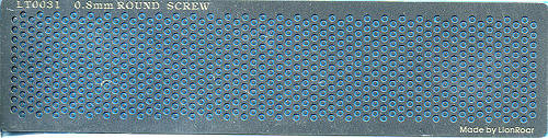 From Lion's Roar comes this very interesting set of etched metal detail pieces. These are .8mm round screws (actually, I think they mean screw heads). No scale is given though they look to be applicable to items about 1/35 scale. No instructions are provided on their use, either. These are somewhat unique in