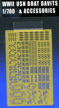 This time, the new 1/700 photo etch set is for US ships. This is a set of boat davits in three different styles; one that is attached to the outside of the hull, one just inboard and a third type that doesn't swing around, but lowers the boat into the water. In addition, there are rests on which the boats will fit along with oars and rudders for the boats that come in the kit. Sufficient to take care of several ships.