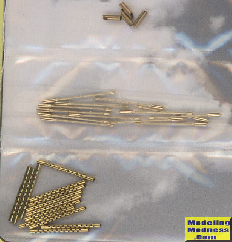 The packet includes 13 guns. This includes separate barrels and cooling jackets. One simply inserts the barrel through the jacket and into the hole you have drilled to accept it. This hole is .7mm so it is not large. The upper four items are those angled extensions you see on later B-17G nose and tail turrets. For my use, they will simply be unneeded extras.