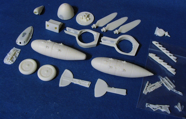 New to the second edition are that some of the more delicate parts that are part of the drop tank/mount assembly are now made from cast pewter. This allows these parts to be able to handle the sometimes rough treatment that this set gets from transportation. Also cast in pewter are the starting crank, machine gun barrels and the gear retraction struts. As with all cast bits, there is a bit of a seam to be removed. Another change is that the drop tanks are now a forward and rear half. This is to prevent any problems with mold slippage on larger parts. Be sure that the package states '2nd Edition' to be sure you are getting the metal parts.