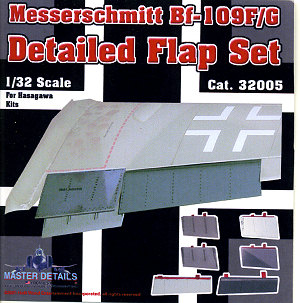 This latest set from Master Details is for the Hasegawa 1/32 Bf-109F/G series and contains direct replacement parts for the kit's flaps and radiator exhaust. These parts are a great deal finer in their molding and detail than what you get with the kit parts, which look clunky by comparison. While the package states that these are for the 109F/G, they can be used on the K kits as well for the wings were the same in all variants.