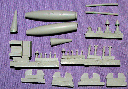 The bomb itself is in two parts, just like the real thing. There is a jig provided to help align the separate tail fins, a very nice touch. The attachment points are shown on the tail of the bomb. Pylon or TER lugs are also included. You also get conical nose plugs, Mk 43 Target Detecting nose pieces, M904 Mechanical Impact Fuzes, M953A1 Mechanical Time Fuzes and two Fuse extenders. My set came with both fuse extenders broken from the resin pour stub. This set is superbly molded as are all Master Details sets. All resin kits with require a small amount of clean-up to remove molding flash and sprue gates.