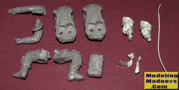 The kit itself is flawlessly cast and all the modeler has to do is remove the remnants of the pour stubs from the resin parts and choose a head. The body of the figure is in five pieces and you get two different torsos depending on whether or not your figure is wearing an oxygen mask or not. With that in mind, you get two different heads, one with a mask and the other without. For the one with a mask, a bladder is included for you to attach. For the one without, you get a complete mask/bladder piece to drape around the figure's neck. It is these straps that differentiate the two torso pieces. A long oxygen hose is included. Also included is a parachute pack. These men did not always wear this so would have it stowed nearby.