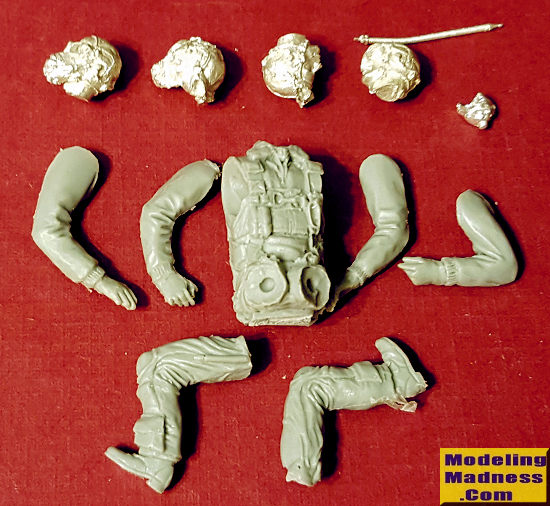 The kit itself is flawlessly cast and all the modeler has to do is remove the remnants of the pour stubs from the resin parts and choose a head. The body of the figure is in five pieces and you get two different sets of arms. One is as on the cover illustration while the other is in a more relaxed pose. Master Detials casts its heads in metal and you get four. Two wearing an O2 mask and two not. Two have the goggles atop the helmet and two have them lowered so you get a lot of options. There is a separate mask and hose for the options not wearing the mask.