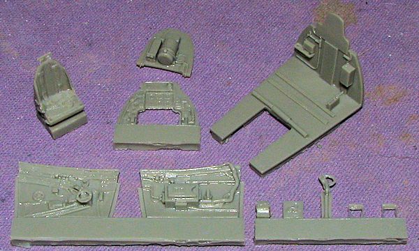 For their next cockpit set, Pavla has decided to do one of the Trumpeter 1/48 Vampire FB.9. This set pretty much replaces kit bits, though you will have to remove the area behind the seat to install the resin replacement. The set includes a new floor with rear bulkhead, side panels, instrument panel, rudder pedals, control column gun sight and a bit that fits on the back of the nose wheel door assembly. A new seat is included that not only has more detail, but also has the harness incorporated into the mold.