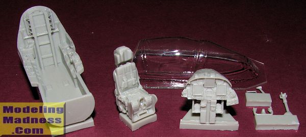 The set includes a new tub with console and back wall detail, a new ejection seat, instrument panel with rudder pedals, control stick and a couple of smaller bits. These bits fit onto the new clear windscreen and canopy. This canopy is molded so that the windscreen and canopy section are separate so you can bose it open to show the interior detail.