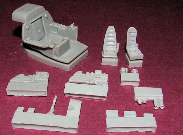 This next Pavla upgrade set is a full cockpit for the venerable, but still nice Matchbox 1/72 F3D Skyknight. The set consists of a new cockpit tub, two new seats with head rests, control column and rudder pedals for the pilot, two different instrument panels, a panel anti glare shield and two ieces that fit behind the cockpit seats. There are also some panels for the inside of the fuselage as the Matchbox interior is pretty bare. One will have to remove the kit instrument anti-glare panel. The reason for the two instrument panels is that one is for the standard night fighter and the other for the electronic warfare version. One needs to check references as the later version will normally have a dark gull grey interior instead of the black one used in the night fighter version.