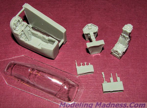 Thanks to Pavla, we now have a proper resin cockpit set for the Heller 1/72 Mirage 200C. This set is a complete replacement for the kit bits. Included is a complete tub, bang seat, instrument panel with coaming control stick, rudder pedals, HUD braces, throttle and canopy actuating piston. A replacement vacuformed windscreen and canopy are also part of the set. You do have to remove the kit intrument panel anti-glare shield and the back bulkhead piece. A great set to really enhance your next Heller 1/72 Mirage 200C/
