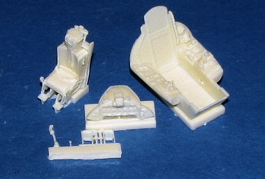 Pavla has done a nice set for the Trumpeter 1/48 F9F-2 Panther. The set is not complex at all and consists of a nicely detailed tub, ejection seat, instrument panel (with instrument blanks so you can put in your favorite instrument decals) and small bits like control stick, rudder pedals and tail hook actuating lever for the instrument panel. As so often happens to resin sets when the pieces are allowed to rattle around in a plastic container, mine suffered some breakage of fine items. At least one of the little bits goes on the seat and one on the side console, but I've not figured out the third little piece as of yet. Despite that, this will be easy to repair once I figure where they all go. The set also includes a parts ID section and painting guide. This set is a no-brainer and replaces the kit parts on your next Trumpeter F9F-2.