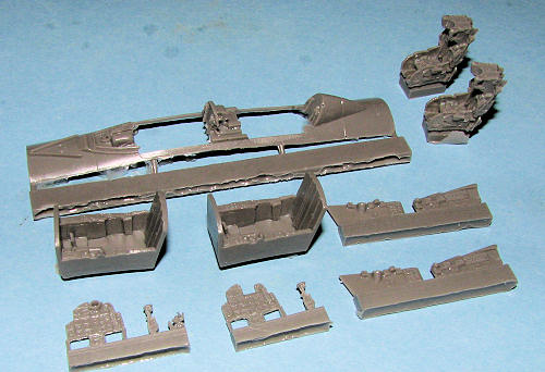 As many of you know, Trumpeter's kits are good, but often times they don't have the most accurate cockpits around. This set is for the Trumpeter 1/72 two seat SU-15 and provides not only a full cockpit (two tubs, two seats, two new instrument panels, new sidewalls with detailing and control sticks), but also a new upper fuselage cockpit insert. These are all direct replacements for kits parts and no additional cutting or grinding is necessary to get them to fit. The instructions are basically painting guides along with drawings to ensure that you get the right parts in the right places. As you can see, the molding is superlative and will go a long way to improving the look of your kit.