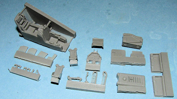 Here is another super cockpit set with extras from our friends at Pavla. This set is for the Hobby Boss AH-1S/F (the AH-1S was redesignated AH-1F about 15-20 years back). This set is a complete replacement for the kit parts and includes a very nicely detailed cockpit tub with seats, sticks and foot pedals among other things. There are also some finely molded armor plate sections a new instrument panel and coaming for both. This particular set includes an ammo bay for the nose gun with both doors and a floor section as well as fore and aft bulkheads. One will have to cut away the molded in doors to use this.