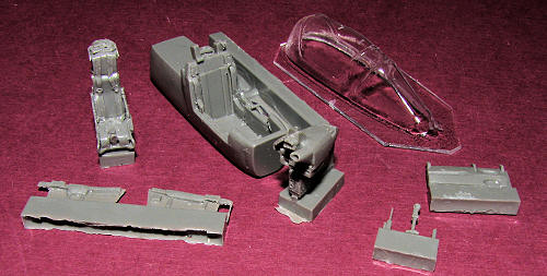 Included in the set is a brand new and very detailed cockpit tub with the appropriate seat, a one-piece instrument panel and anti-glare coaming, new control stick and sidewall pieces. The cockpit tub section includes the nose wheel well section so a new nose gear door is also included.