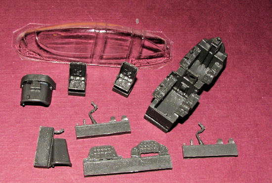Now we get to the whole enchilada, so to speak. Pavla has provided us with a complete cockpit upgrade set for the Heller T-28 Trojan kit. This provides a full tub with detailed side consoles, two instrument panels, two seats, the proper fore and aft instrument panel coaming as well as new control sticks, rudder pedals and throttles. There is a new three section canopy to show off all the work as well as a gun sight for the forward seat in the chance you are building an armed version.