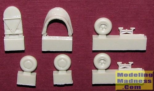 This new Pavla set is designed for the relatively new Airfix 1/72 Tiger Moth kit. This set consists of a new forward bulkhead, rudder pedals, a blind flying cover for the back seat and two different wheels. One set of wheels has covers and the other is spoked. Also included but not shown as they are small and broke free during shipping are a pair of venturis.