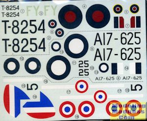 This set's major feature is that it comes with markings for five different airplanes. In no particular order, one is a camouflaged plane with 611 Squadron RAF coded FY. Next is an Aussie plane serialed A17-625 in overall trainer yellow. In
