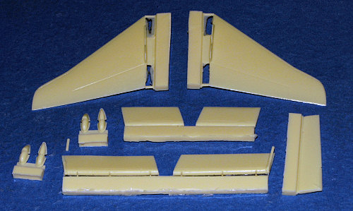 The latest Pavla resin set is for the Airfix 1/48 Harrier or Sea Harrier. This set is control surfaces that are designed to replace the ones in the kit. One has to cut away some of these items and then replace them with the more sharply detailed Pavla pieces. The set includes complete rear stabilizers, a new rudder, new ailerons and new flaps. A set of hinges is also provided so that you can pose the flaps in something other than the neutral position. My set had a tiny breakage, but it should be easily repaired.