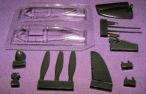 Those who read the preview Pavla review were probably wondering about why there was a cockpit set for an early MC.200 when Italeri doesn't do one. Well this particular set will backdate that Italeri kit to the earlier version with the full, enclosed canopy. The set includes two canopies (sectional so that the cockpit can be displayed), a backlight section with the small rollover frame, a larger rollover frame, new prop blades, hub and spinner. Also included is a new rudder, tail wheel doors and the long skinny things are canopy rails with smaller front and rear pieces to blend that into the fusealge.
