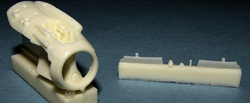 More great bits for the Hobby Boss MiG-15bis from Pavla. This particular set is a replacement undernose section that includes the intake and nose gear well. This is all molded into one piece and is superbly detailed. One does have to remove the similar section from the Hobby Boss kit to use it. The set includes new nose gear doors and cannon barrels. Not unexpectedly, the gun barrels broke from the resin pour stub and while two of them are still floating around the package, the third is not to be found. These can be replaced by either stretched sprue or very fine tubing.