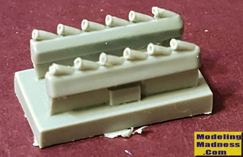 This nice set of resin exhaust is designed for the 1/72 Tamiya P-51D Mustang. This is a set with the shrouds above the exhaust. In many post war planes, this shroud was removed so check your references when doing a post war plane. These are really quite small, which is why a visual inspection will probably not catch the somewhat flattened initial stacks on both sides nor the slightly short shot one in the fore stack. These are direct replacements for the kit bits.