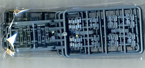 This is one of two releases from a brand new company from Japan, Raupen Modell. This particular set is for the Japanese Ground Defense Force's Type 90 main battle tank. This set of links is without the rubber pads with the other set including those pads. Each of the track links consists of an upper and lower piece that traps a joiner piece that goes to the next link. The set comes with four bags each containing ten sprues s you see above. This will make four complete links. An image of these links glued together is shown below.