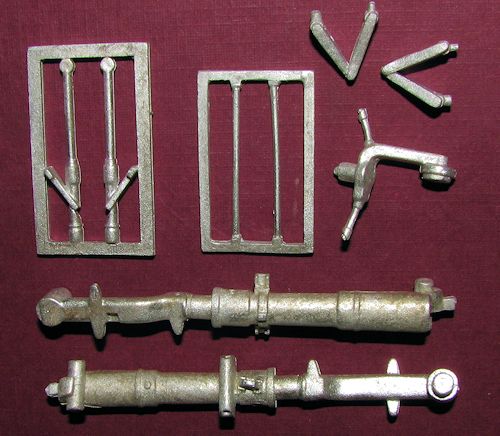 This Scale Aircraft Conversions set is for the very large Kinetic 1/24 P-47D Thunderbolt. This is another kit I've not seen, but as you will note, it has two very hefty main gear legs, oleo scissors, retraction struts and a tail gear. The retraction struts are encased in metal sprues to keep them from breaking during shipment. This set has enhanced details and offers the main gear struts as a single piece, which is a real help. This set is nicely molded and is a direct replacement for the kit parts.