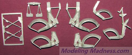 This Scale Aircraft Conversions set is for the recent 1/32 H-K Models Gloster Meteor IV and if they do other versions, I'm sure it will fit those as well. The set is quite hefty and includes main gear, nose gear and various struts. These gear have the mud guards as an integral part of the landing gear as the plane was expected to operate from dirt/grass strips. This superbly cast metal set has the smaller bits in a metal sprue to protect them. The set is a direct replacement for the kit bits as well.