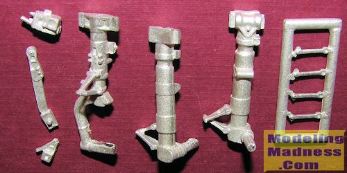 This Scale Aircraft Conversions set is for the new Kitty Hawk 1/32 F-86D Sabre and their upcoming F-86K variant. The set includes two main landing gear legs, the nose gear leg, retraction strut for the nose gear, landing light piece and nosewheel steering box. It also includes the four braces for the outer main landing gear doors. What is really nice about this set is that the main gear legs are all one piece and you don't have to worry about assembly or alignment of these bits. For this reason alone you should pick up this set. The set is nicely molded and is a direct replacement for the kit parts.