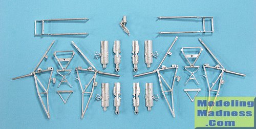 This Scale Aircraft Conversions set is for the new Tamiya 1/32 DH Mosquito. As you can see, the British never went for the 'single massive gear strut' theory for their big planes and so you have a considerable number of thin pieces to make up the landing gear. There are all the various bits for the main gear legs and two pices for the tail wheel. Since there are so many long, thin pieces, you'll need to do a bit of straightening when assembling this set. The set is nicely molded and is a direct replacement for the kit parts.
