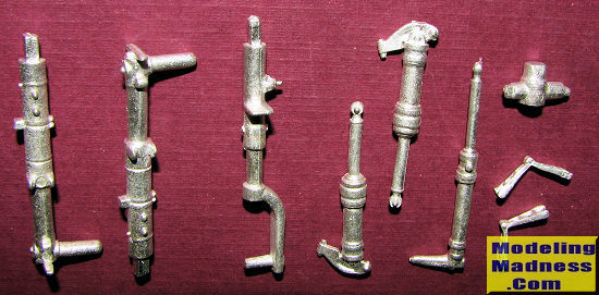 This Scale Aircraft Conversions set is for a kit I have yet to see, the new tool Revell 1/32 scale two seat Me-262B-1. I am betting that these will also fit any single seat version that may come later. You get the two main gear legs with oleo scissors and retraction struts. The main gear leg, its retraction strut and its mount are also part of the set. I have seen photos of some 262s with an oleo scissor on the nose gear strut, but apparently the B model did not have it. These are direct replacements for the kit parts and are nicely molded.