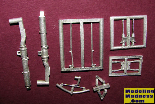 Here is a relatively simple set of gear. This Scale Aircraft Conversions set is for the Hasegawa P-47D Thunderbolt in 1/32 scale that has also been released by Eduard. It consists of the main gear struts, oleo scissors, retraction struts, what look like brake lines, gear door braces and a tail wheel strut. These are direct replacements for the kit parts and are nicely molded. This set replaces 32015, which has been discontinued.