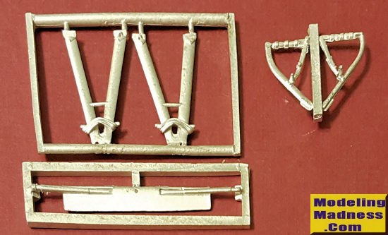 This Scale Aircraft Conversions set for the Wingnut wings Sopwith 5F.1 in 1/32 scale. The set consists of the two main landing gear strut assemblies, the axle bar with airfoil and what looks to be a choice between two different tail skids. These are direct replacements for the kit parts and are nicely molded.