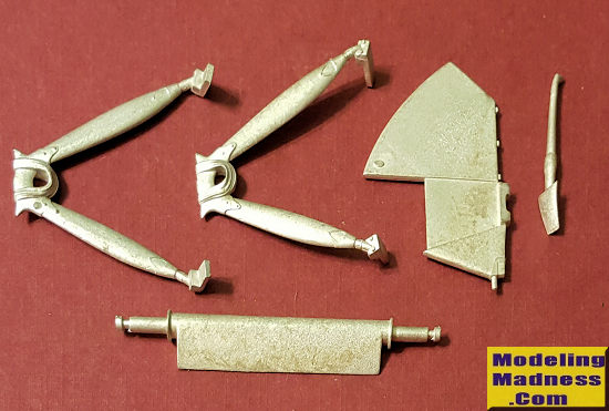 This Scale Aircraft Conversions set for the Wingnut Wings 1/32 LVG C VI. The set consists of the two main landing gear strut assemblies, the spreader bar with airfoil and tail skid.. It also includes what appears to be the fin. The casting is very nicely done and these are direct replacements for the kit bits.