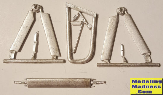 This Scale Aircraft Conversions set for the Wingnut Wings 1/32 FE.2b late version. Typical of WWI types, you get the two sides of the landing gear along with a spreader bar/axle and a tail skid assembly. As to the two smaller items inside the main gear legs, I have no idea what those might be as they are two different lengths. These are direct replacements for the kit parts and are nicely molded.