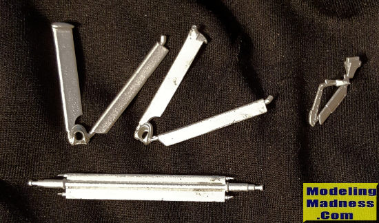 This Scale Aircraft Conversions set for the Wingnut Wings 1/32 Re.8 (early). The set is standard WWI stuff consisting of the two main legs, a spreader bar/axle and a separate tail skid piece. These are direct replacements for the kit parts and are nicely molded.