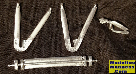 This Scale Aircraft Conversions set for the Wingnut Wings 1/32 Re.8 (late). The set is standard WWI stuff consisting of the two main legs, a spreader bar/axle and a separate tail skid piece. As you can see when comparing this set with the early set, the gear legs are of a sturdier construct. These are direct replacements for the kit parts and are nicely molded.