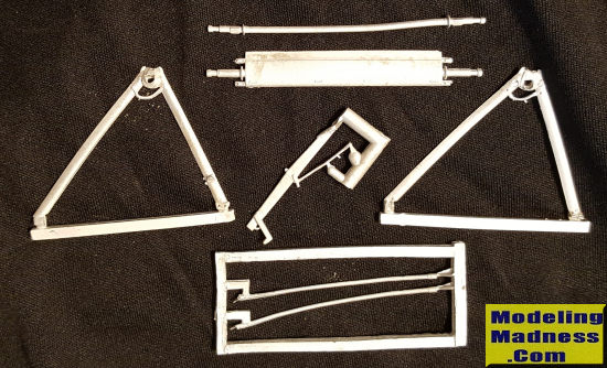 This Scale Aircraft Conversions set for the Wingnut Wings 1/32 Halberstadt CL.II. Typical of WWI types, the set provides the two main landing gear legs along with a tail skid. This set provides a pair of axles, one includes a center 'wing' style spreader bar and the other is plain. There are also two other struts included and I have no idea where those fit. Note that it is not unusual for long, skinny pieces in metal sets to need some straightening. It is a simple task that, as in this case, can often be accomplished by rolling the part on a hard surface. These are direct replacements for the kit parts and are nicely molded.