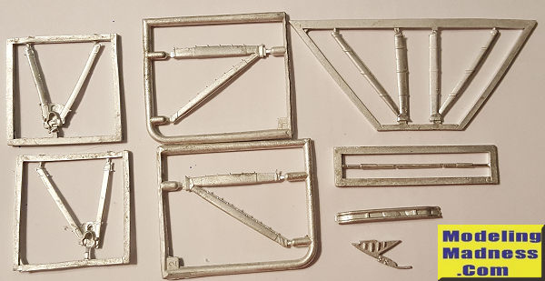 This Scale Aircraft Conversions set for the Copper state 1/32 Nieuport XXI. This set contains the two main landing gear legs along with the axle cross bar and a tail skit. It also includes V struts. There are two different types provided so I'm assuming one is early and other late. These are direct replacements for the kit parts. Like all SAC sets, they are nicely molded.