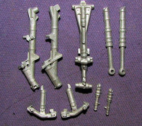 This Scale Aircraft Conversions set is for the recent Mirage F.1 from Kitty Hawk. This will fit both the single and two seat kits. It consists of the complex two piece main gear with its two retraction struts. A single cast nose gear strut is also part of the package.
