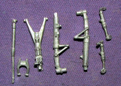This Scale Aircraft Conversions set is for the relatively new Kinetic 1/48 Kfir C2/C7. The set includes the two main landing gear legs with their retraction struts. For the nose gear, the fork for the nose wheel is separate and there is a separate and rather long retraction strut. This set is a direct replacement for the kit pieces and is very nicely molded. As happens, you may find the thinner bits to be a bit bent, but these are easily straightened.
