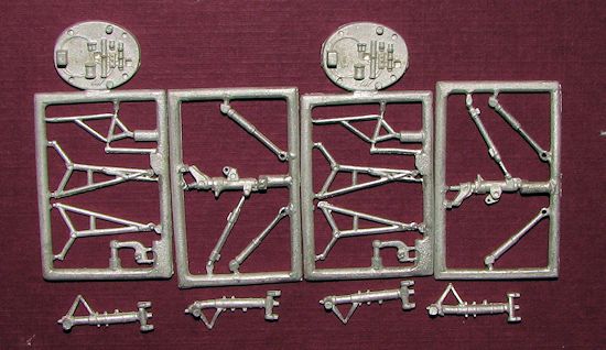 This Scale Aircraft Conversions set is for the new Kinetic 1/48 Fouga Magister. This kit has also been double boxed by Wingman, hence the reason for two full sets. Most of the parts are encased in metal sprues to keep the bits unbent as they are mostly rather thin. You get the main gear legs, the two part nose gear as well as retraction struts for the main and nose gear. You also get what appears to be a nose gear bulkhead. I've not seen the kits so that is why the guess. The molding is excellent and these are direct replacements for the kit bits.