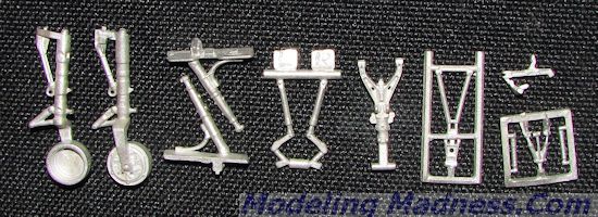 This Scale Aircraft Conversions set is for the recent Kitty Hawk 1/48 F-101 Voodoo. Should Kitty Hawk decide to do other versions, I'm betting these will fit those as well. The Voodoo landing gear are particuilarly complex and SAC has done a fine job on this set. There are main gear legs with the built in brakes, retraction struts, one set of which is handed and provided on metal sprue. The main gear strut also has a bunch of additional pieces, several of these molded on metal sprues to protect them. This set is nicely molded and is a direct replacement for the kit parts.